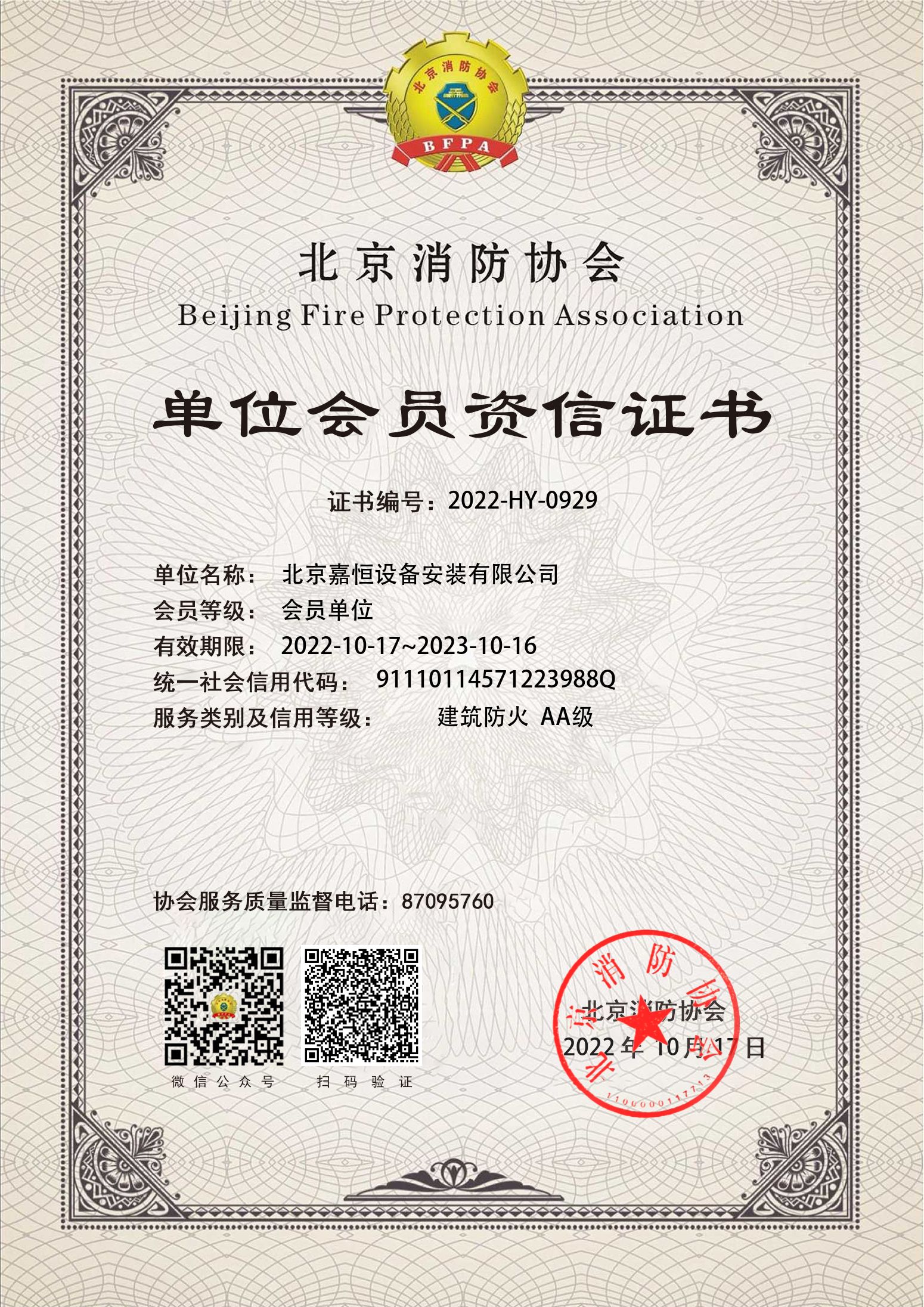 北京消防協(xié)會單位會員資信證書