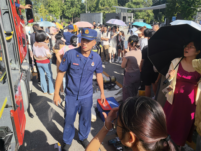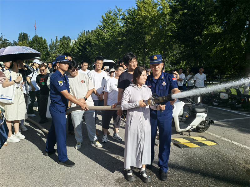 “我是第一次穿上這身衣服,沒想到行動這么笨重,手腳一點(diǎn)都不靈活,想想平時消防員穿戴這套裝備進(jìn)行訓(xùn)練,滅火時要穿著裝備爬樓,消防員們實(shí)在是太辛苦了。”首都醫(yī)科大學(xué)國際學(xué)院的學(xué)生一邊脫下戰(zhàn)斗服,一邊跟消防員說到。在活動現(xiàn)場,共設(shè)置消防技能培訓(xùn)區(qū)、疏散逃生體驗區(qū)、消防裝備器材體驗區(qū)、消防車輛展示區(qū)、滅火器實(shí)操區(qū)、安全常識教育區(qū)六個區(qū)域,展示滅火、搶險救援各類消防車輛以及滅火、防護(hù)、破拆、救生、偵檢等消防器材裝備,吸引了眾多師生參觀體驗。消防員現(xiàn)場演示鋪設(shè)水帶滅火,講解消防安全知識、滅火器操作方法,手把手指導(dǎo)師生正確使用滅火器,讓師生“沉浸式”掌握滅火技能,并組織分組進(jìn)行“滅真火,出真水”實(shí)操演練,給大家上了一堂精彩的消防知識教育課。