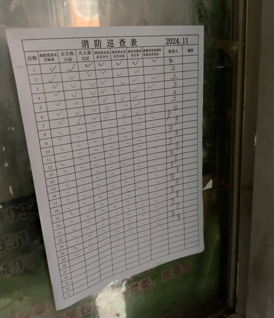 既然真實(shí)存在疏散通道被堵占的問題,為何張貼在單元門口的消防巡查表卻在“疏散通道是否暢通”一欄全打了對(duì)鉤?上述物業(yè)公司負(fù)責(zé)人支支吾吾,無法作出合理解釋。左志軍認(rèn)為該物業(yè)公司未如實(shí)記錄防火檢查情況,“我們已責(zé)令其限期改正,如果逾期未改正,我們將依法處罰。”